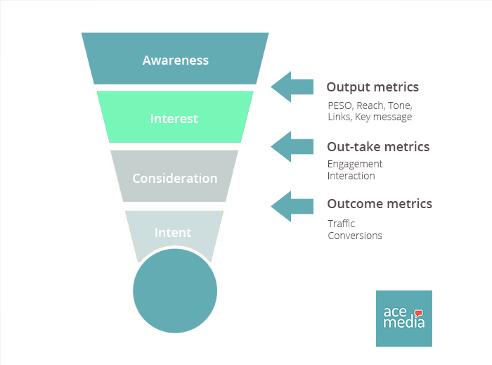 A metric funnel helps identify the best KPIs at each stage of the campaign: Awareness, Interest, Consideration, Intent. Align with AMECs framework to source KPIs suited to the outputs, out-takes, and outcomes of the campaign.